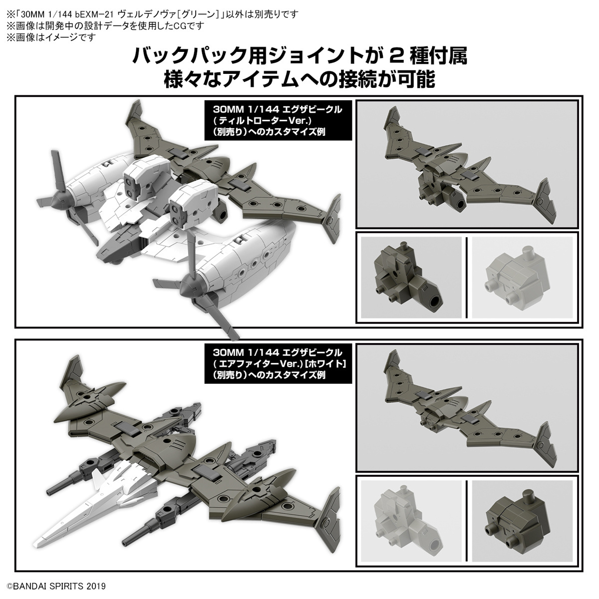 Bandai introduces the Verde Nova, the inaugural flying-type mecha of the Byron Army, to the "30MM (30 Minutes Missions)" lineup! This kit offers the versatility of crafting two interchangeable heads from its parts. The rifle is attachable to backpacks and other 3mm joints through the provided joint parts. Notably, the backpack and chest components are detachable, doubling as a flight unit. Two variations of backpack joints are included for connection to diverse items, alongside multi-joints for further customization options.