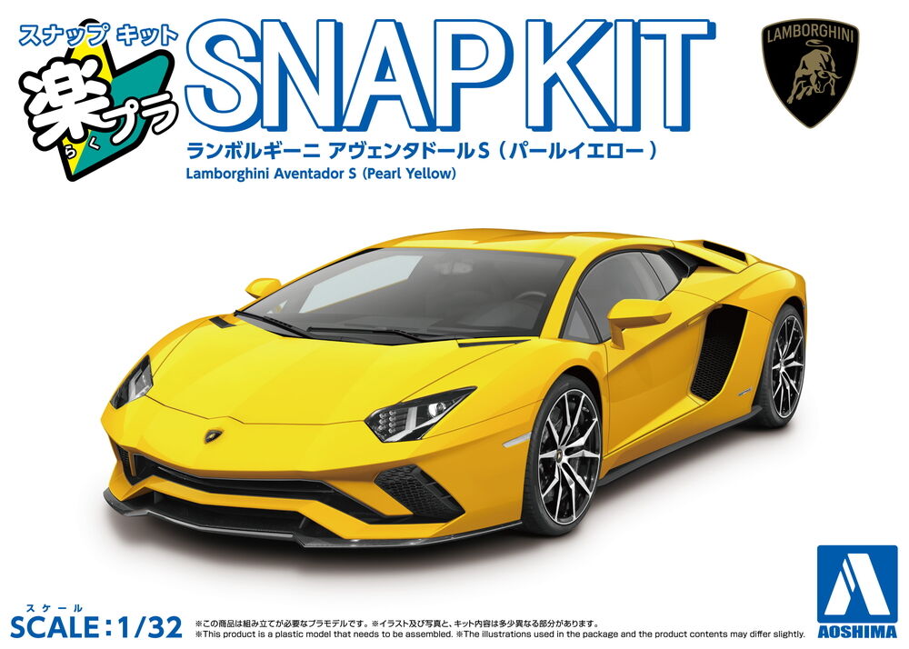Aoshima’s 1/34-scale Lamborghini Aventador S Pearl model kit in yellow features detailed interior and exterior components.