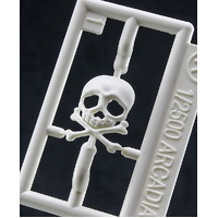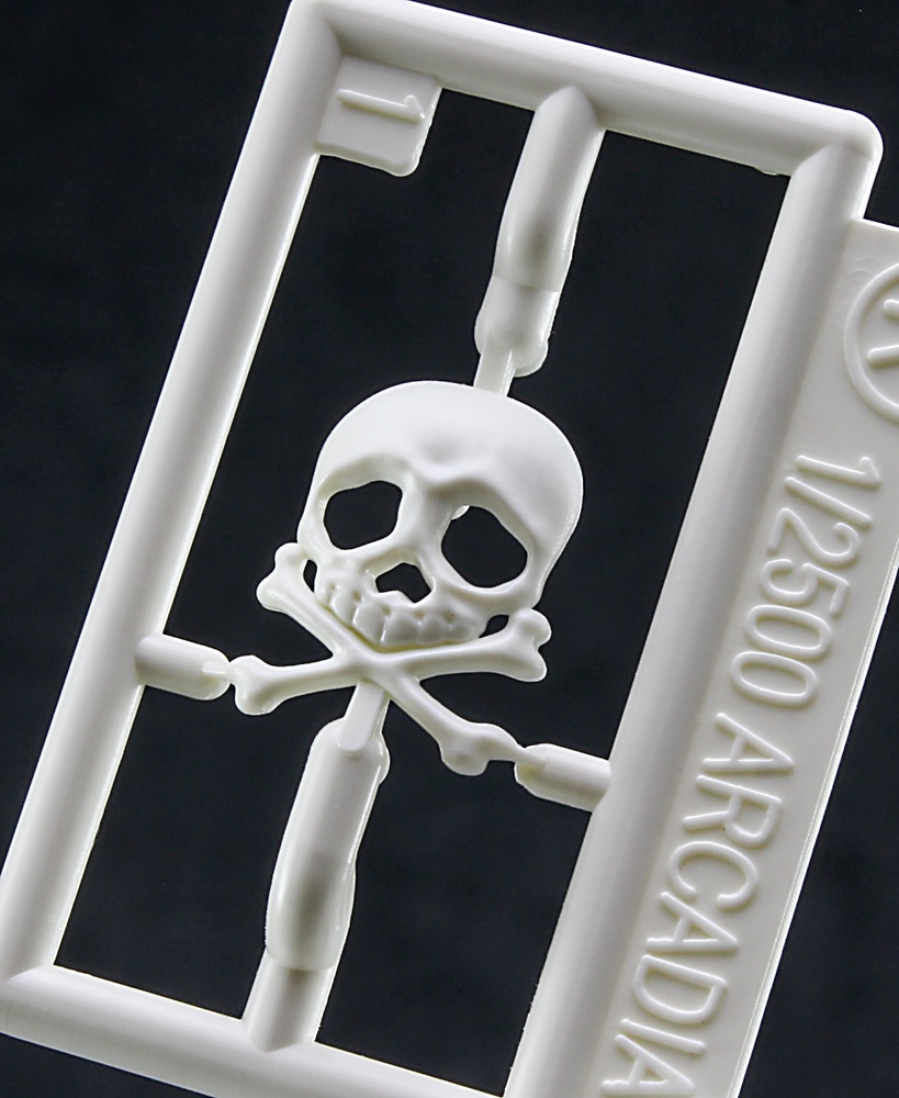 Captain Harlock's mighty Arcadia Ichiban spaceship, from the manga "Captain Harlock Dimensional Voyage," gets its first model kit from Hasegawa! The six-toothed skull on the bow is a new part (the classic five-toothed skull is also included), and no glue is required for assembly; it's molded in green, brown, white and black to simplify painting. The triple pulsar cannon's turret can swivel, and the barrel moves up and down; the Space Buster (quick-firing gun) can also move up and down. In addition to the skulls, a replaceable knife-shaped ram part for the bow is also included! A clear stand to display the Arcadia Ichiban in flight is included too. Inspire yourself and order this iconic ship for your own collection today!