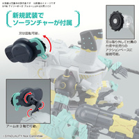 Bandai introduces the Daisy Ogre Alter, an upgraded version of the Daisy Ogre mecha from the anime "Synduality Noir." This model kit includes new weaponry like the Gamilant Blade, Saw Launcher, and an extended assault rifle. The assault rifle can be used with two hands thanks to its expandable front grip. The Gamilant Blade can be displayed in both deployed and stowed positions, and the Saw Launcher has a rotatable blade that can be detached and displayed separately. The cockpit and coffin components are highly detailed with sliding and opening features. The kit also includes mini figures of the main characters, Kanata and Noir, and offers options to change the leg design for various poses. Stickers are provided for additional customization.