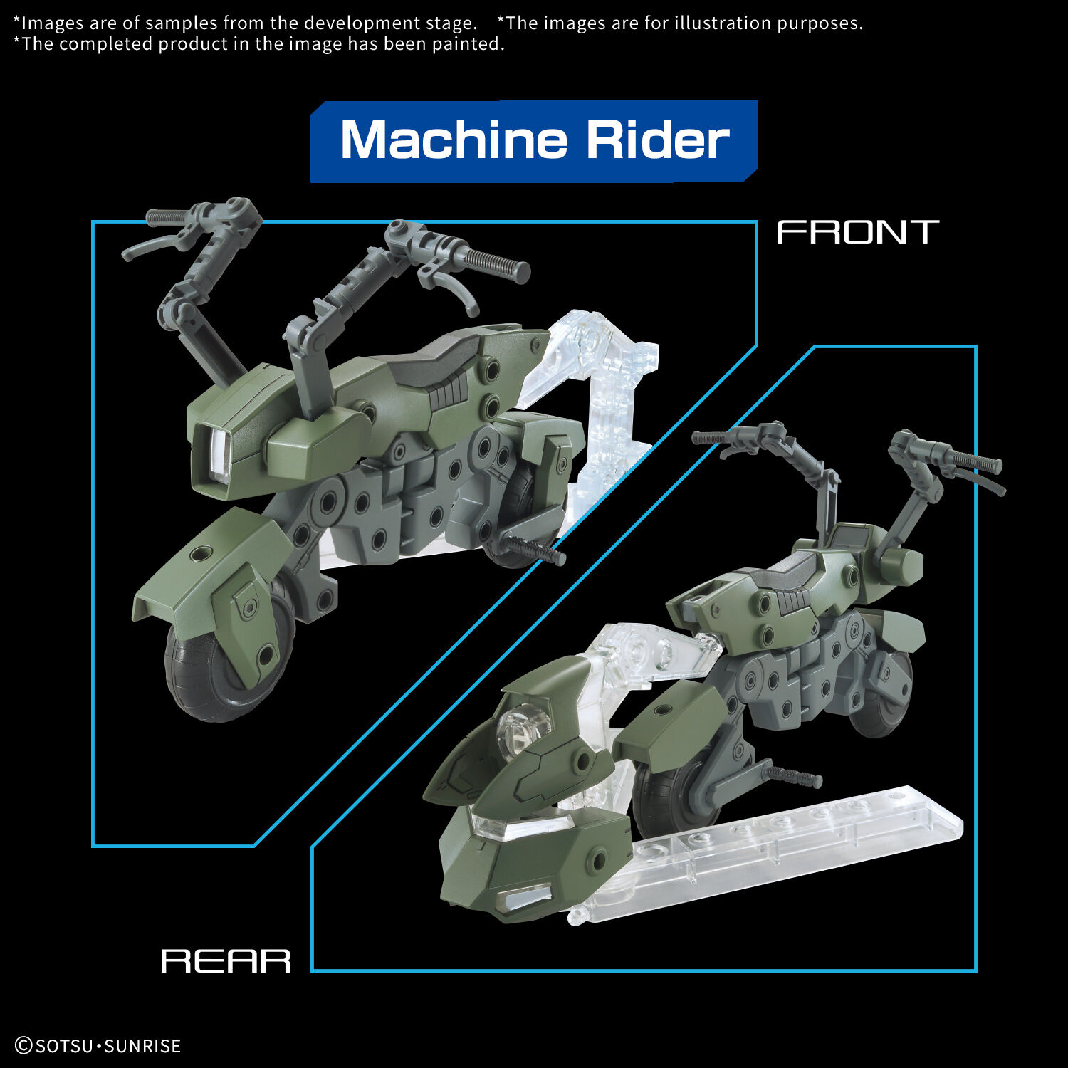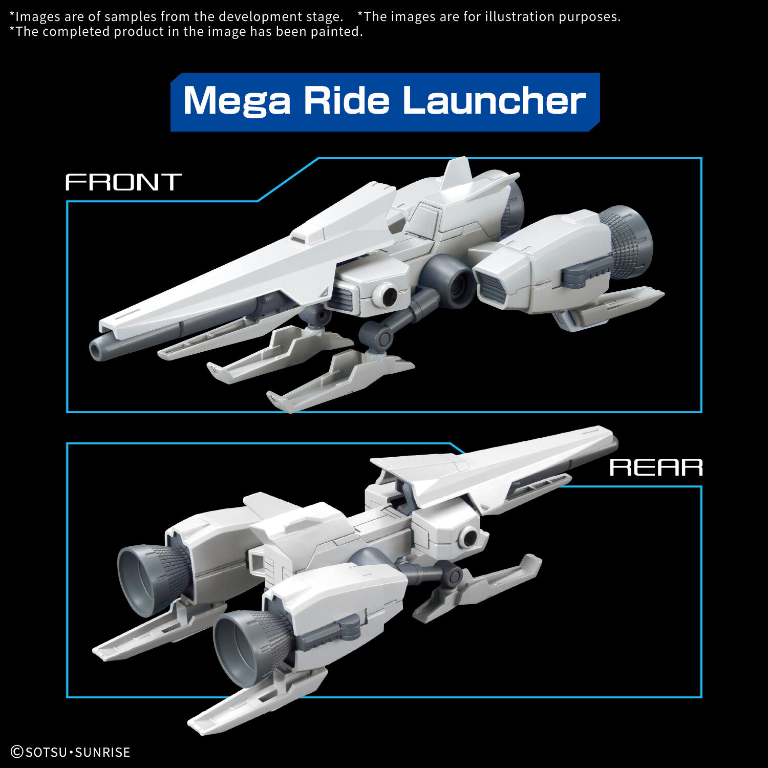 Bandai’s Mega Ride Launcher & Machine Rider option set lets the Mega Ride Launcher switch between Mega Rider and Mega Launcher modes, perfect for recreating mobile-suit towing scenes. Joint parts are compatible with all HG series. The Machine Rider transforms between ride and stand positions, and three front cowl patterns are included for customization.
