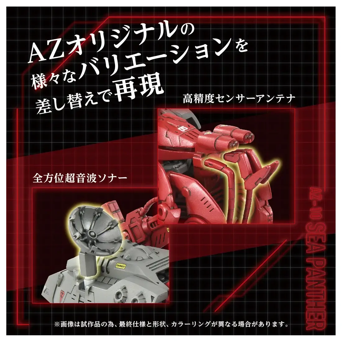 Takara Tomy’s AZ-10 Sea Panther joins the high-end Zoids Advanced Zi model-kit line, featuring an electric motor that moves its legs in a running motion. It includes a rear hatch with a 12-barrel missile system that also functions as the power switch, plus an electrically driven rear beam cannon and rotating side fans. The weapons can be manually transformed into firing mode, and it comes with an unpainted pilot figure for the cockpit.