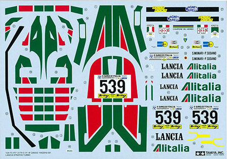 This plastic model kit is designed to a 1/24 scale, measuring 178mm in length, 89mm in width, and 50mm in height. The kit meticulously captures the imposing look of the car, complete with a substantial chin spoiler, over fenders, roof spoiler, and rear wing.Interior details such as bucket seats, the dashboard, and other components are intricately replicated, providing a realistic three-dimensional effect. The kit also includes a driver figurine to occupy the entire cockpit. Furthermore, the front wheels are fully functional and can be steered for added realism. The kit features striking red and green graphics, along with numerous sponsor logos, including the prominent Alitalia branding, which are skillfully applied using slide decals.